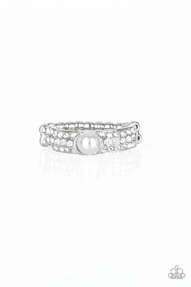 A pearly white bead is pressed into the center of a dainty silver band encrusted in blinding white rhinestones for a glamorous finish. Features a dainty stretchy band for a flexible fit.