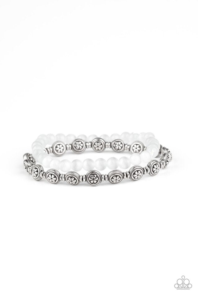 One strand of silver floral beads and one strand of dewy white cat’s eye beads are threaded along stretchy bands, creating whimsical layers around the wrist. Sold as one set of two bracelets.