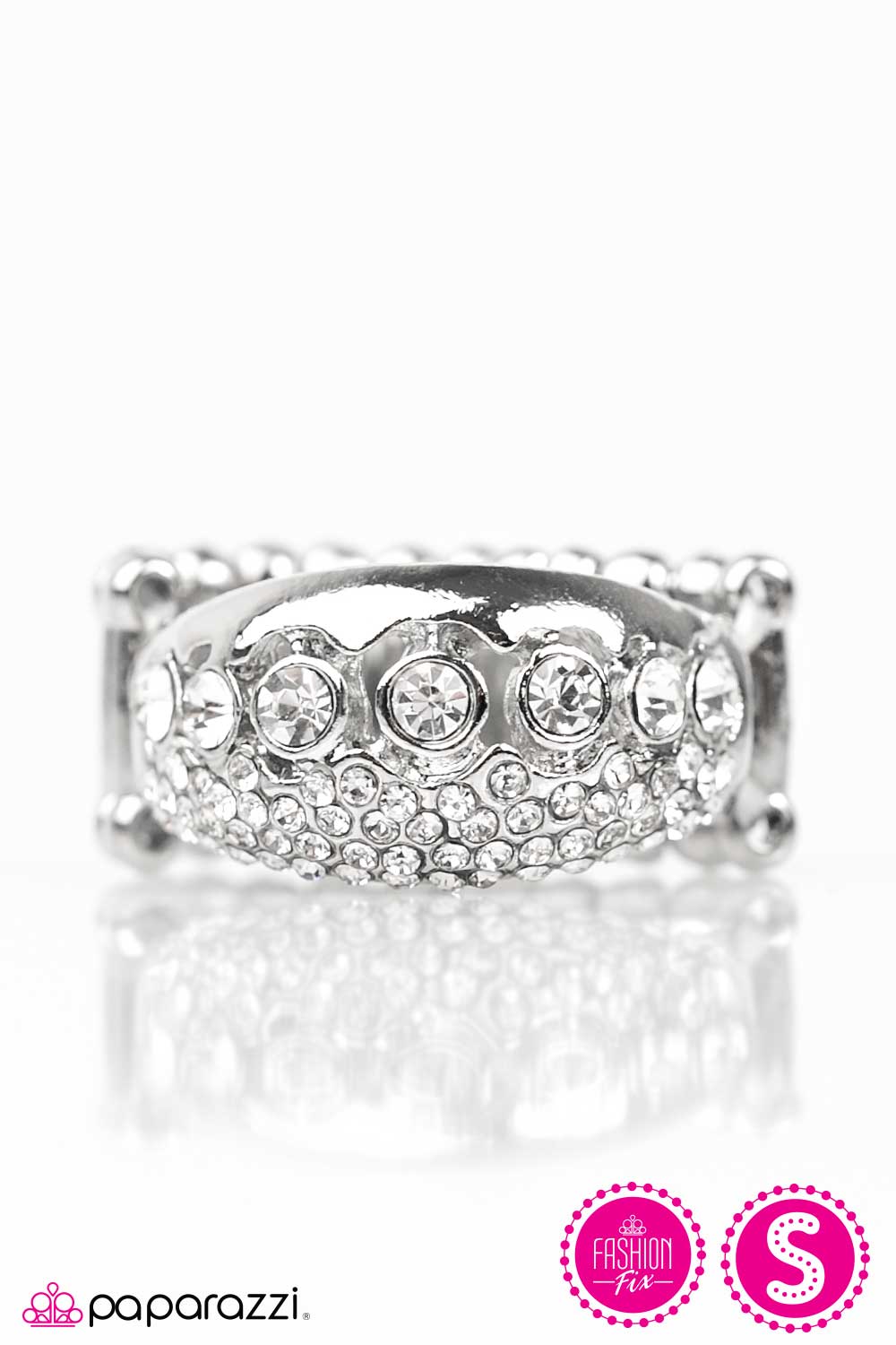 Countless sparkling rhinestones are sprinkled across a glistening silver band. A silver bar bows just below the incandescent sparkle, revealing a row of larger white rhinestones for a timeless finish.