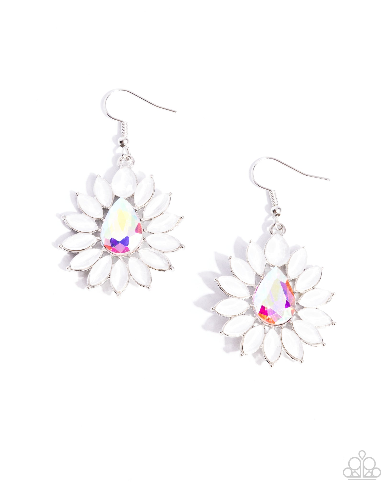 A teardrop iridescent gem is encircled by opalescent white marquise-cut rhinestones, creating a bold floral frame. Earring attaches to a standard fishhook fitting.