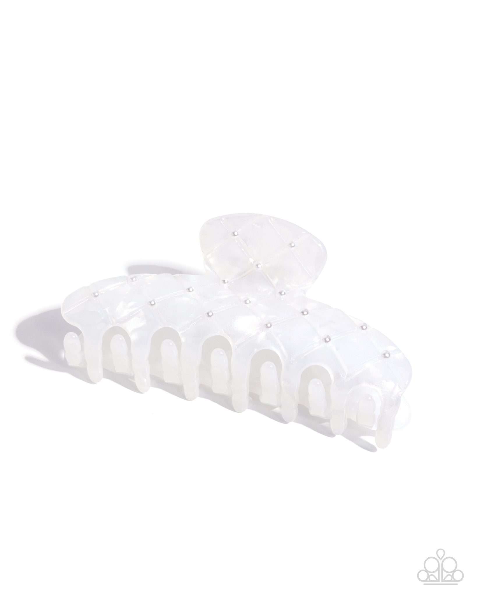Brushed in a delicate quilted pattern, this translucent white acrylic frame is dotted with petite pearl accents for a refined finishing touch. Its wide silhouette secures your hairstyle with a pearlescent swirl that adds a subtle sheen to any look. Clip measures approximately 4" in length and 2" in width.
