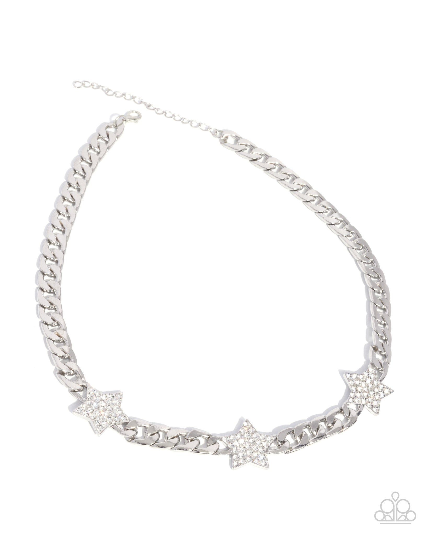 A bold silver curb chain is accented with three sparkling star-shaped pendants encrusted with white rhinestones, creating a glamorous and patriotic statement piece. Features an adjustable clasp closure.