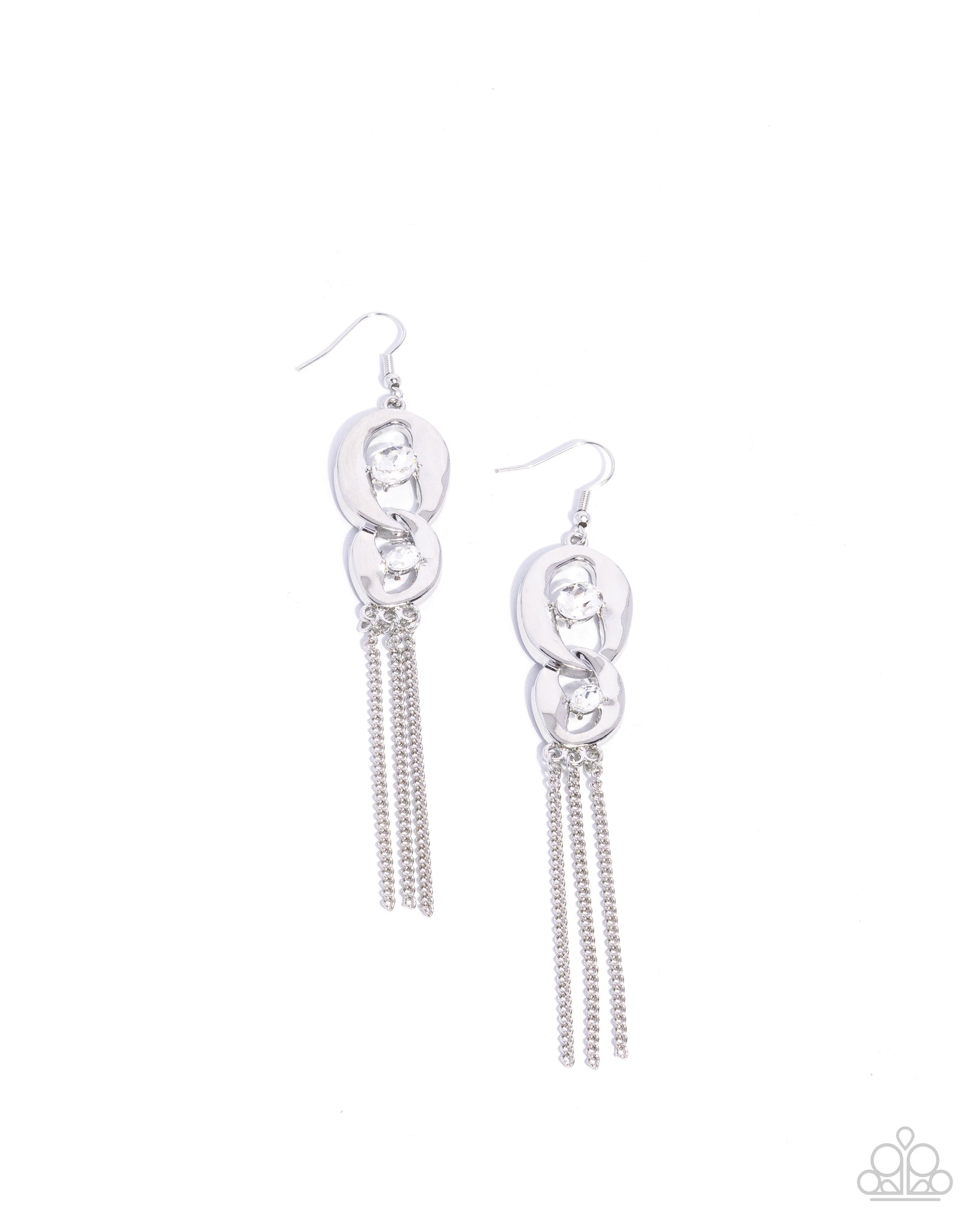 Featuring silver-pronged fittings, tilted white oval gems fit along the center of a duo of abstract circular silver interlocked frames in varying sizes for a handcrafted look. A trio of dainty silver chains cascade below the interlocked frames for additional eye-catching sway and sheen. Earring attaches to a standard fishhook fitting.