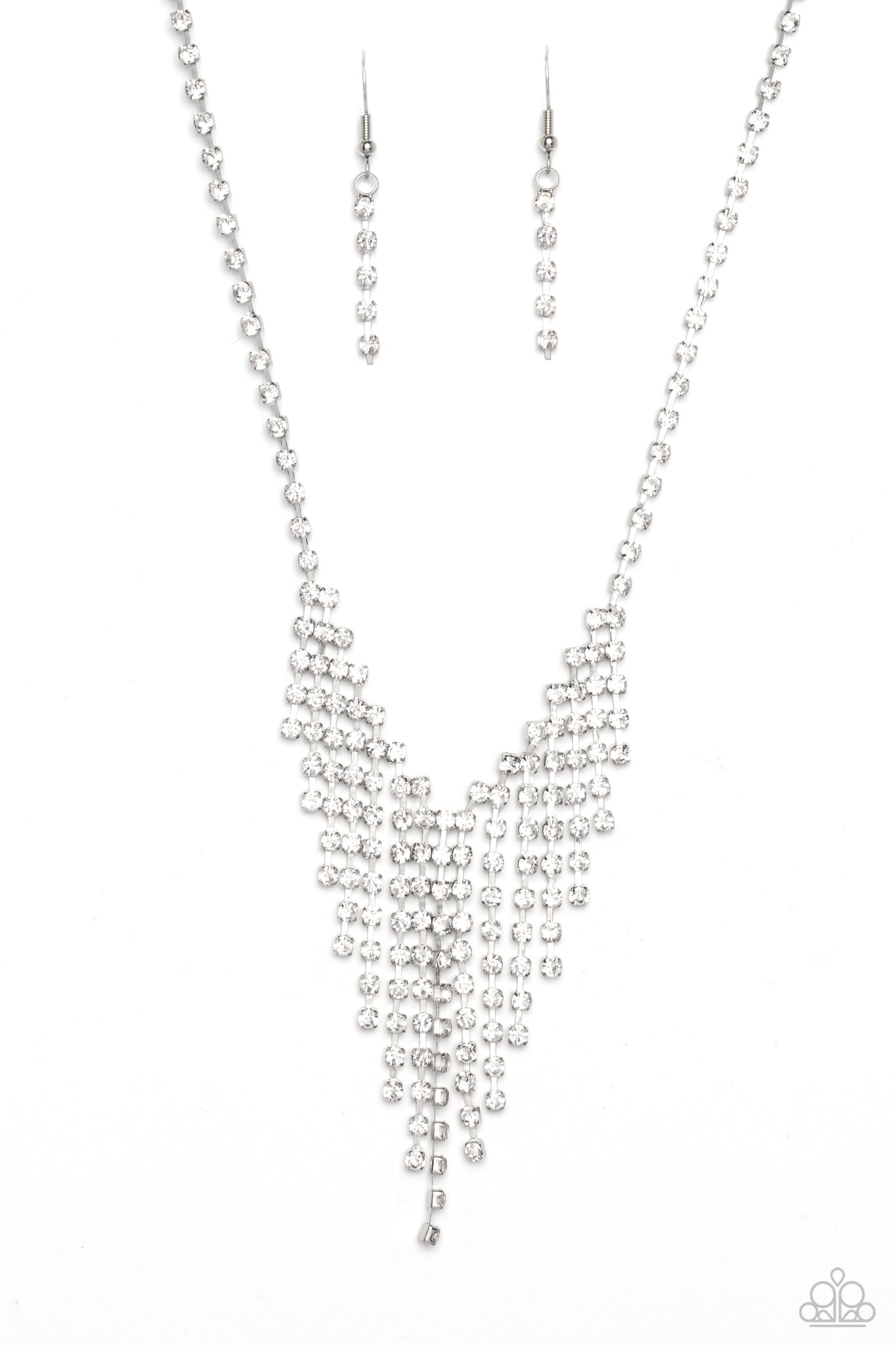 Featuring a sleek silver square fitting chain, glittery strands of white rhinestones stream down the chest for a refined flair. Varying in length, strands of white rhinestones encased in similar silver square fittings stem from the sparkly chain creating a statement-making fringe. Features an adjustable clasp closure.