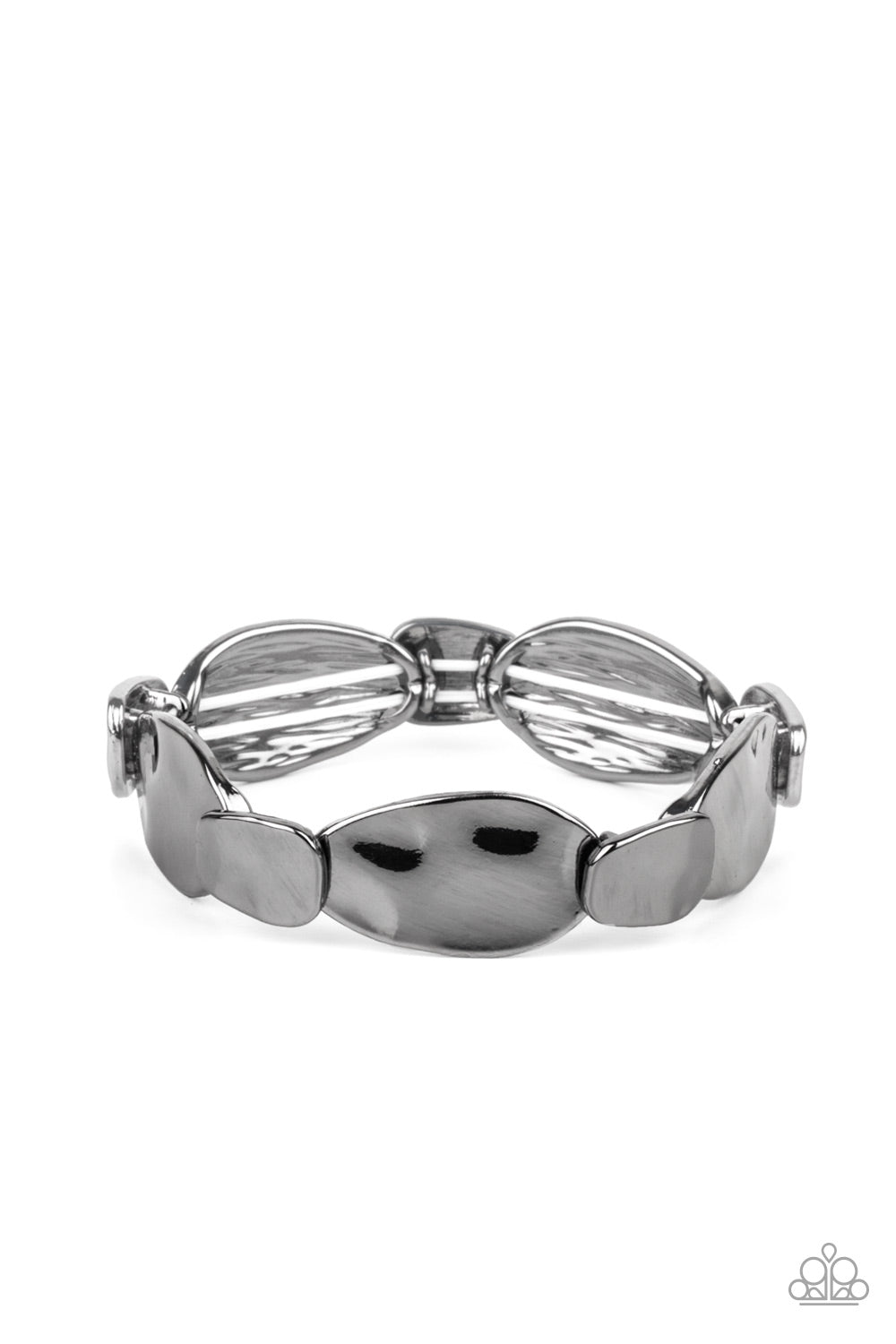 Hammered in shimmery details, asymmetrical shiny gunmetal frames delicately overlap along stretchy bands around the wrist for an artisan inspired look.
