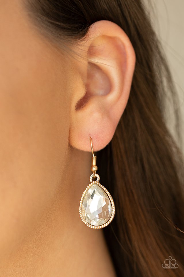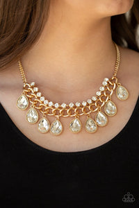 Teardrop rhinestones swing from the bottom of a bold gold chain, creating a dramatic fringe below the collar. A strand of glittery white rhinestones attach to the top of a shimmery gold chain, adding a refined flair to the flashy statement piece. Features an adjustable clasp closure.