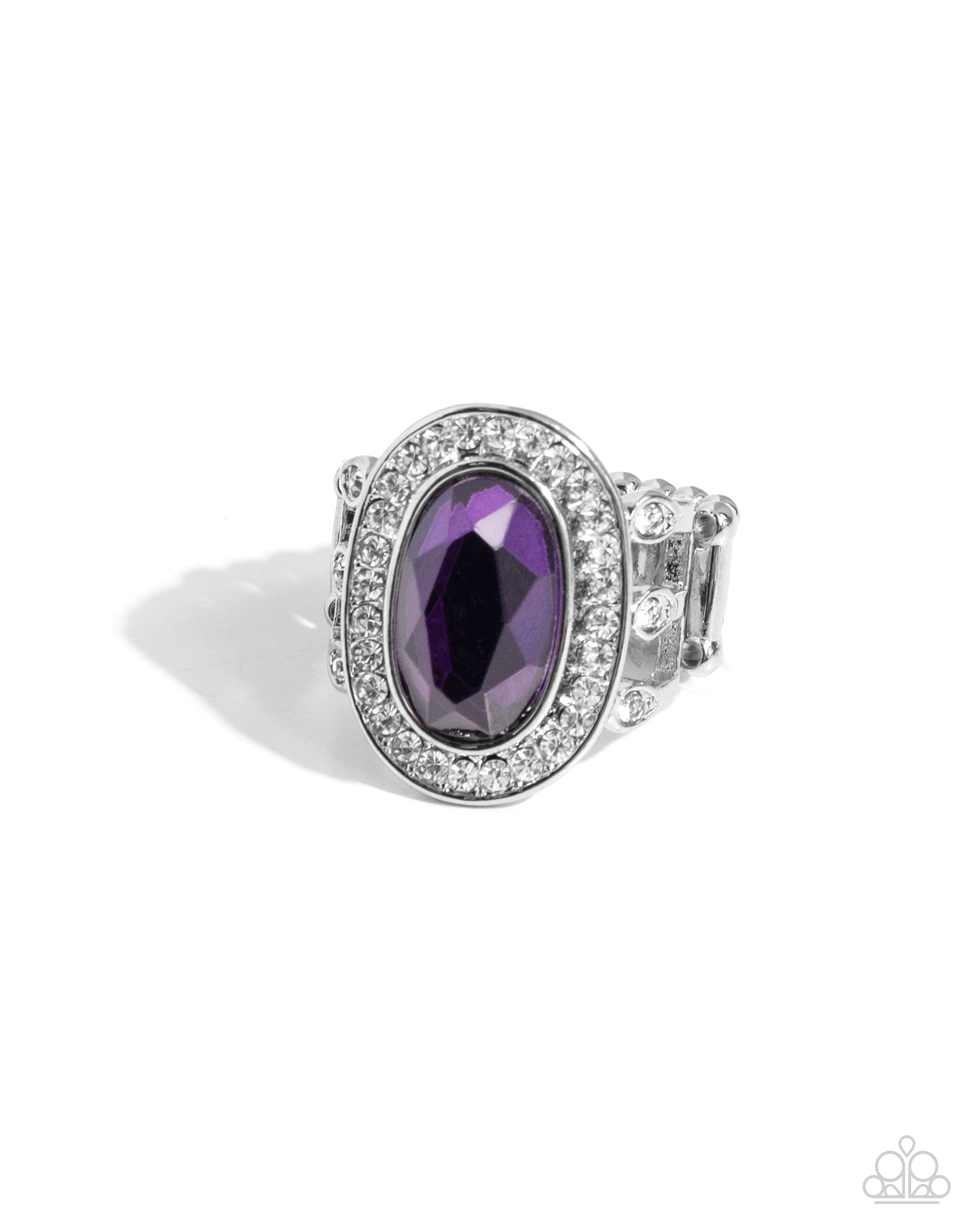 An oversized oval purple gem is pressed into the center of a white rhinestone encrusted silver frame atop white rhinestone dotted silver bands, creating a glamorous centerpiece atop the finger. Features a stretchy band for a flexible fit.