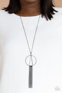 Two gunmetal rods delicately overlap at the top of a gunmetal hoop, creating an abstract pendant at the bottom of a lengthened gunmetal chain. Shimmery gunmetal chains stream from the bottom of the frame, creating a sleek tassel. Features an adjustable clasp closure.