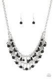 A glamorous collection of bubbly black beads, faceted silver beads, and shiny black teardrop beads alternate along two strands of chunky silver chains, creating a flirtatious fringe below the collar. Features an adjustable clasp closure.