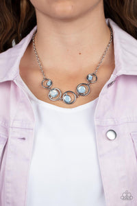 Sporadically infused with dainty white rhinestones, a glittery collection of round, teardrop, and emerald cut opal rhinestones haphazardly adorn the centers of interlocking silver hoops below the collar for a mesmerizing finish. Features an adjustable clasp closure.