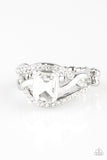 Glistening silver bars and white rhinestone encrusted bands swirl across the finger, coalescing into an airy band. Featuring a regal emerald style cut, a glittery white gem is pressed into the center of the frame for a refined finish. Features a dainty stretchy band for a flexible fit.
