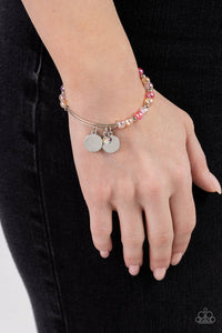 Featuring a subtle iridescent shimmer, a collection of glassy baby pink, peach, and Pink Peacock beads are infused along the wrist beside dainty silver studs for a bodacious pop of color. Two silver discs and an iridescent gem slide along a sleek bar fitting on the dainty silver bangle, creating a sentimental statement. Due to its prismatic palette, color may vary.