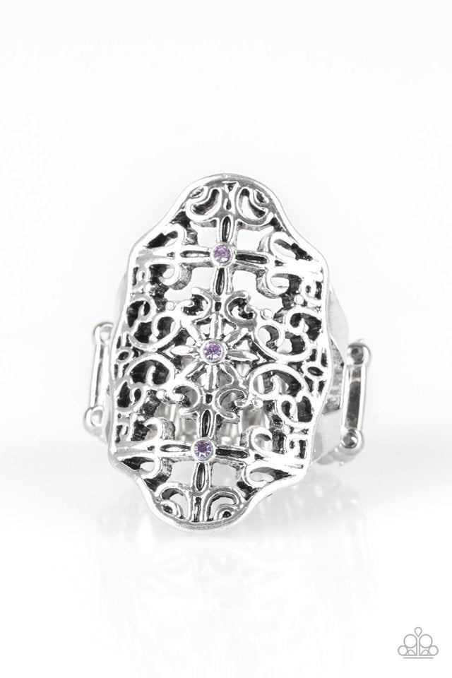 Glistening silver filigree swirls into a floral textile pattern across the finger. Glittery purple rhinestones and dainty silver studs are sprinkled across the ornate silver frame for a whimsical finish. Features a stretchy band for a flexible fit.