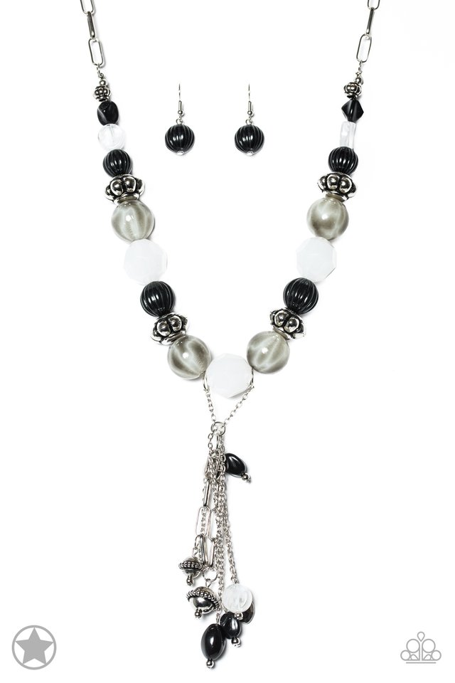 Smooth beads with a marbleized black and white swirl alternate with milky white and silver accents. A tassel of chains in various lengths is decorated with black, silver, and frosty pieces. Features an adjustable clasp closure.