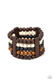 Held in place by rectangular wooden frames, strands of brown, black, and white wooden beads are threaded along stretchy bands around the wrist for a colorfully tropical look.