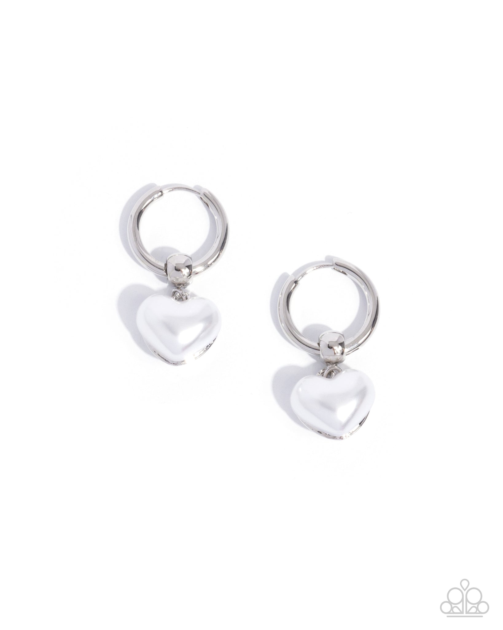Pressed in a silver frame, a pearly white heart sways from a silver beaded clasp along a silver hoop that hugs close to the ear for a smitten statement. Earring attaches to a standard hinge closure fitting. Hoop measures approximately 3/4" in diameter.