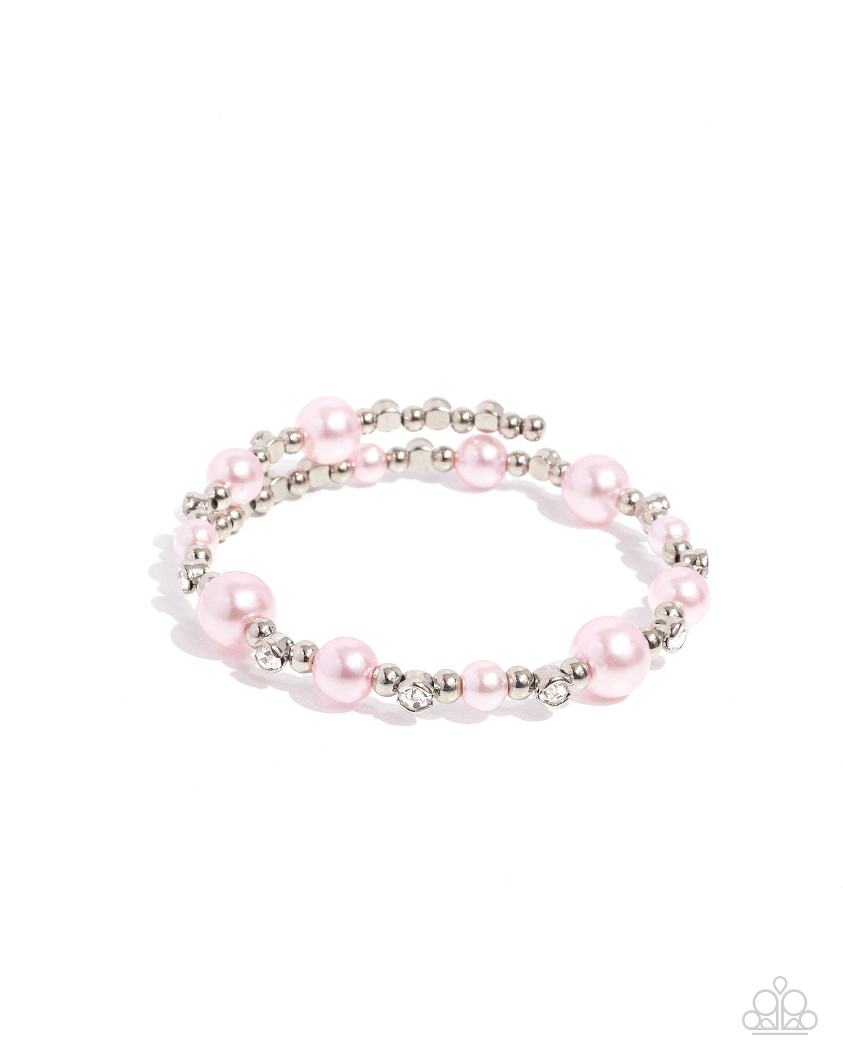 Luscious bubbly pink pearls and brilliant white rhinestones are accented with shiny silver beads threaded along a single wire to create a chicly glamorous infinity wrap bracelet.