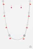 Featuring glassy and polished finishes, dainty red beads join ornate silver frames along a shimmery silver chain for a whimsical look. Features an adjustable clasp closure.