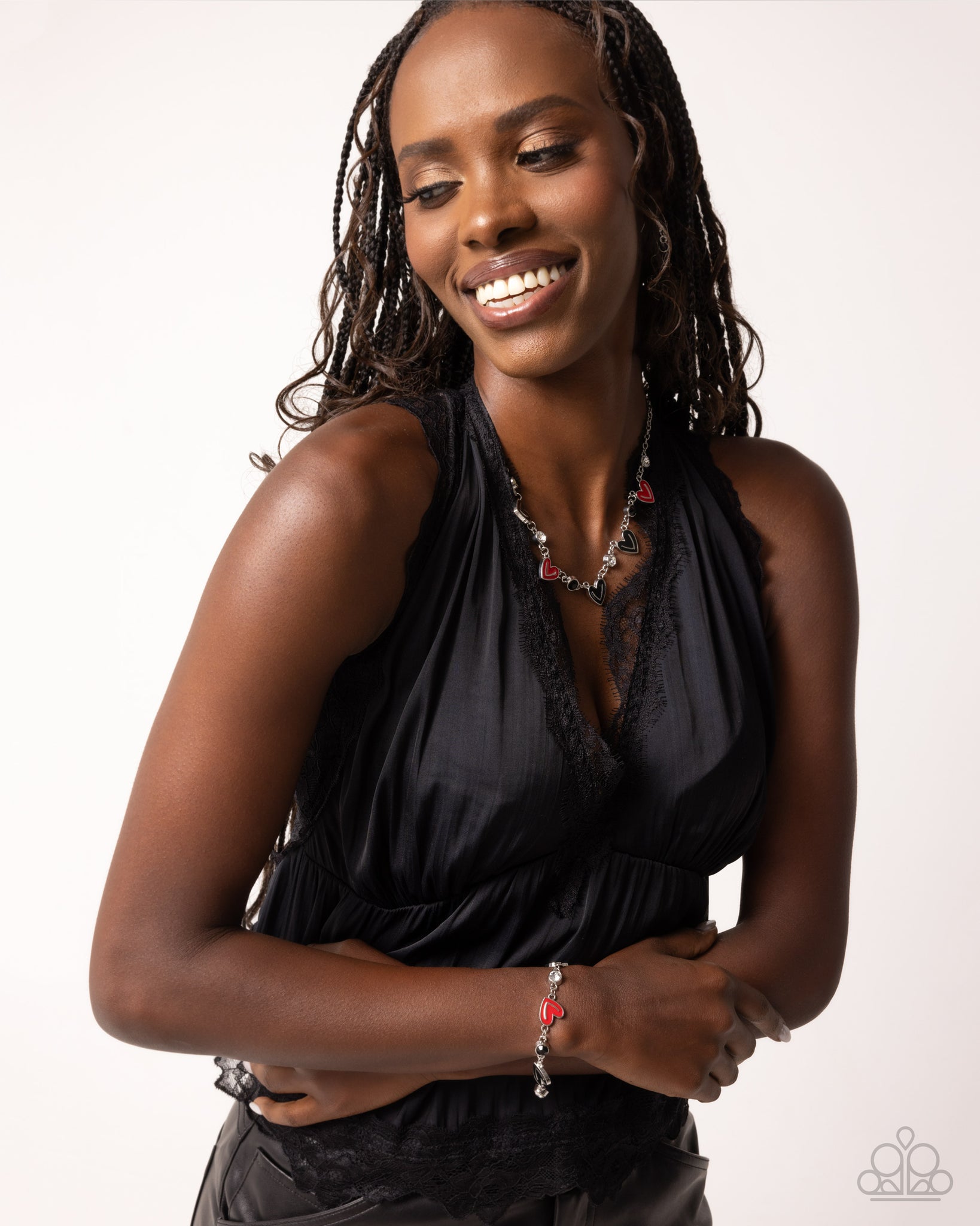 Infused along a dainty silver cable chain, a collection of white and black rhinestones in silver fittings alternate with red and black-painted abstract silver hearts that feature tactile linear detailing along their centers for a fun-loving pop of color below the neckline. Features an adjustable clasp closure.
