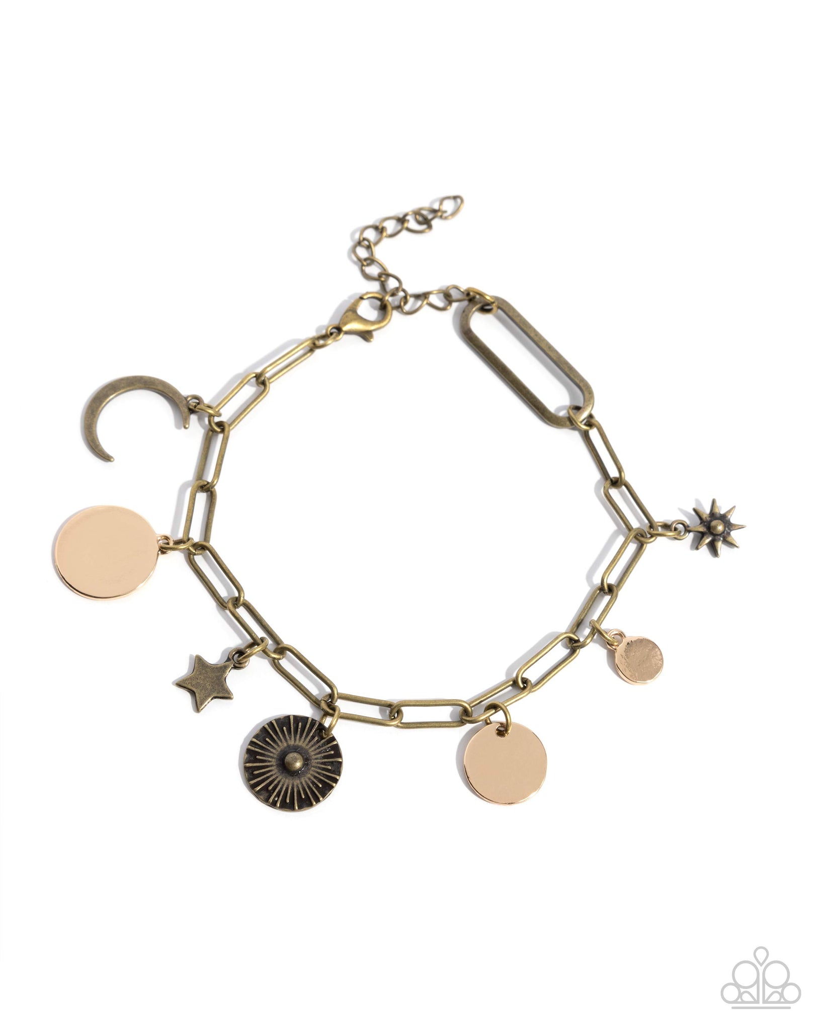 Gliding along a brass paperclip chain, a collection of aesthetic astral charms including a brass star, a three-dimensional brass star, brass discs of varying sizes, a brass sunburst pendant, and a brass crescent moon sway along the wrist. Features an adjustable clasp closure.