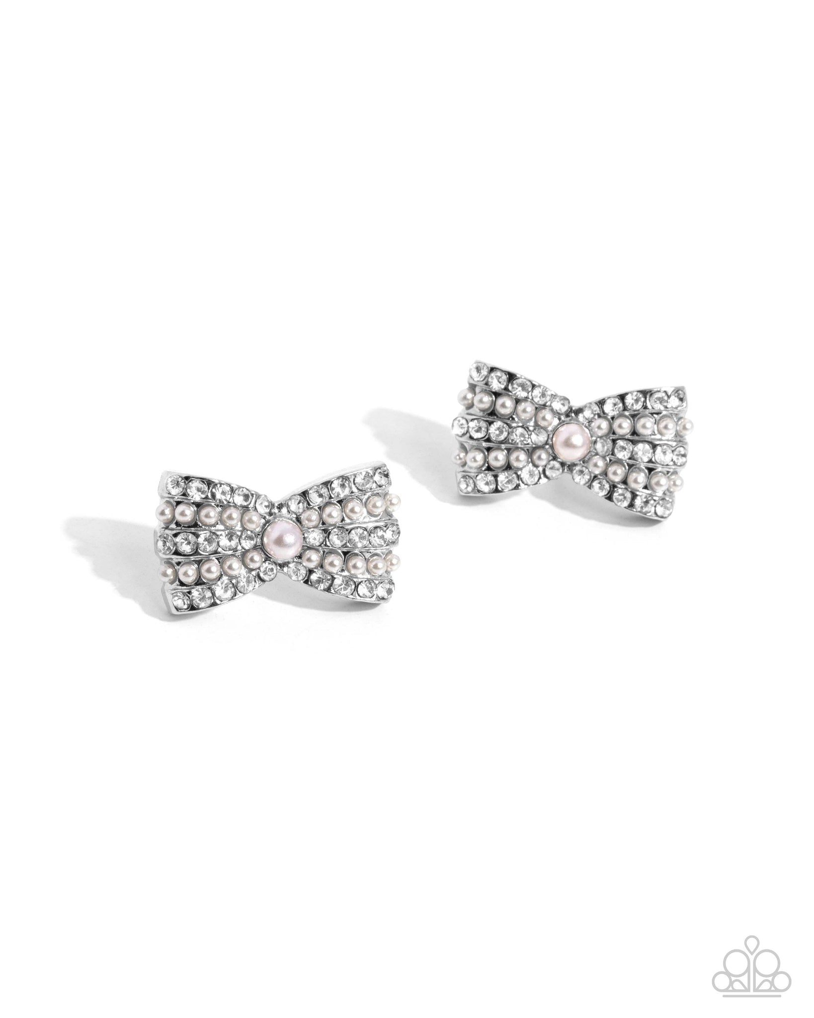 Featuring rows of glistening white rhinestones and baby pink pearls, an airy silver bow is embellished atop the ear from a baby pink pearly center for a dramatically dazzling finish. Earring attaches to a standard post fitting.Sold as one pair of post earrings.
