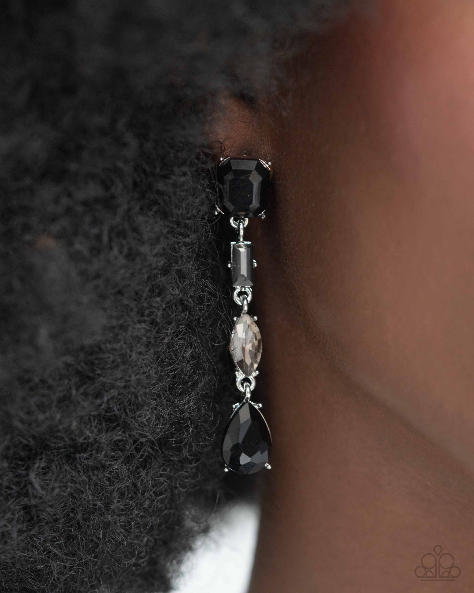 A mismatched collection of various highly faceted black, smoky, and gray gems is linked together in elegant succession as they glamorously cascade below the ear. Earring attaches to a standard post fitting.