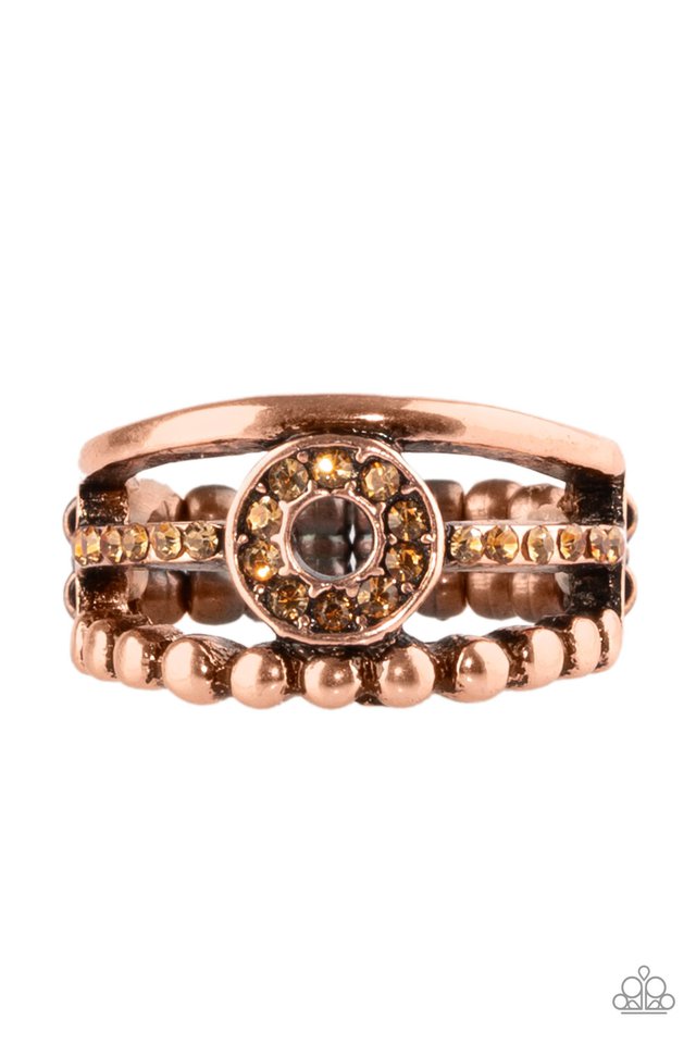 A smooth and dotted copper band flank a topaz rhinestone encrusted band, creating glittery layers across the finger. Encrusted in golden topaz rhinestones, a circular frame is pressed into the center of the bands for a refined finish. Features a dainty stretchy band for a flexible fit.