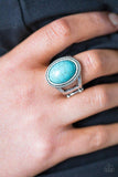 A turquoise stone is pressed into the center of a shimmery silver frame radiating with rustic texture. Features a stretchy band for a flexible fit.