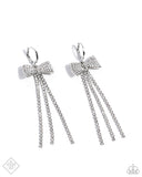 Featuring silver square fittings, high-sheen strands of sparkling white rhinestones cascade from a stunning white rhinestone-embellished bow charm, creating a classy statement at the ear. The stunning bow charm swings along a silver hinge hoop, further displaying shimmer and glam. Earring attaches to a standard hinge closure fitting. Hoop measures approximately 3/4" in diameter.
