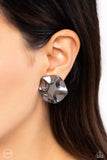 Featuring a high sheen finish, wavy gunmetal discs are hammered and molded into a rustic industrial statement. Earring attaches to a standard clip-on fitting.