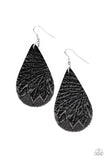 Embossed in a leafy palm-like pattern, an earthy black leather teardrop swings from the ear for a whimsical look. Earring attaches to a standard fishhook fitting.