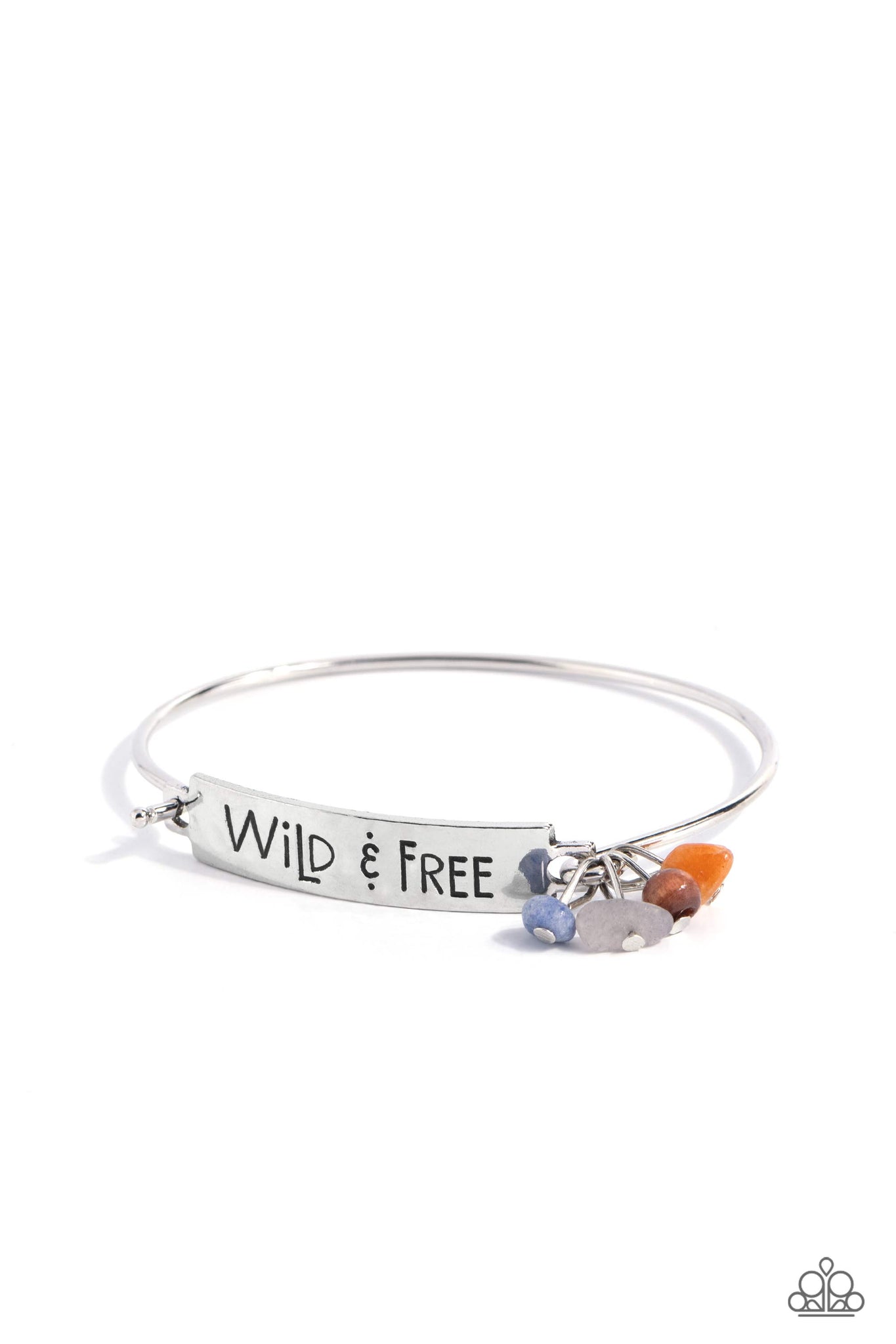 The words "Wild & Free" are stamped across a thick plate of silver in a playful font. An orange stone and two lapis stones combine with a brown wooden bead, gathering at the side of the inspirational centerpiece as it connects to a skinny silver bar that wraps around the wrist. Features a hook and eye closure. As the stone elements in this piece are natural, some color variation is normal.