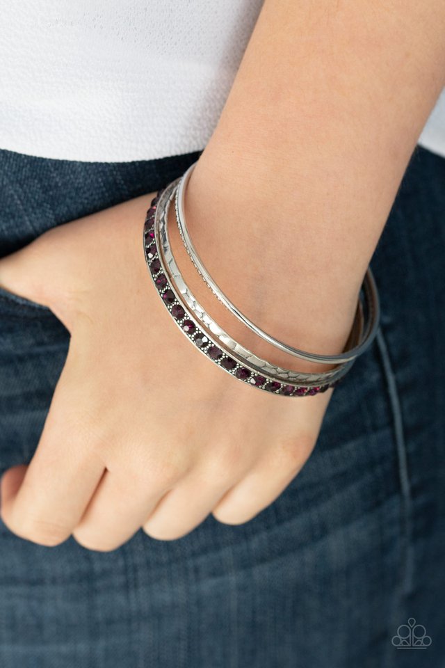 Varying in texture and finish, three dainty silver bangles in a purple rhinestone encrusted bracelet around the wrist for an edgy stacked look.