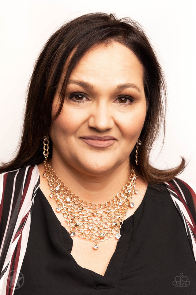 A collar of layered interlocking gold chain provides the canvas for gorgeous clear rhinestones to sway delicately. Features an adjustable clasp closure.