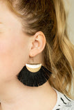 A fan of shiny black thread flares out from the bottom of a shimmery gold crescent frame, creating a foxy fringe. Earring attaches to a standard fishhook fitting.