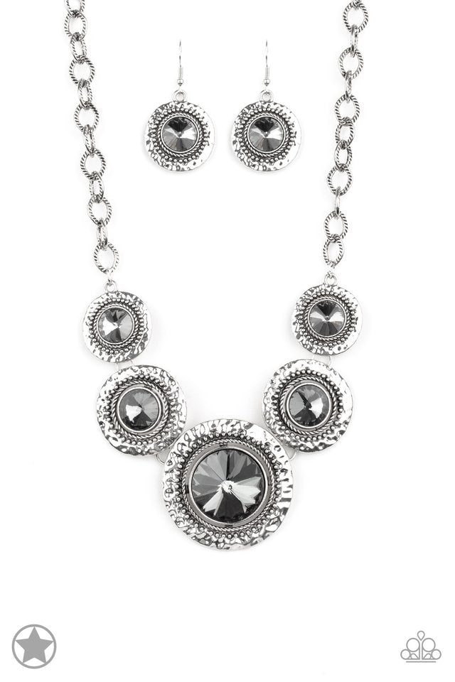 Gradually increasing in size, dramatically oversized smoky gems are pressed into the centers of hammered and silver studded frames. The blinding frames link below the collar for a glamorous, statement-making finish. Features an adjustable clasp closure.