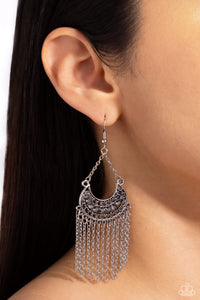 A curtain of silver chains cascades from a decorative silver half moon frame embellished in a row of hematite rhinestones, resulting in a spellbinding fringe. Earring attaches to a standard fishhook fitting.