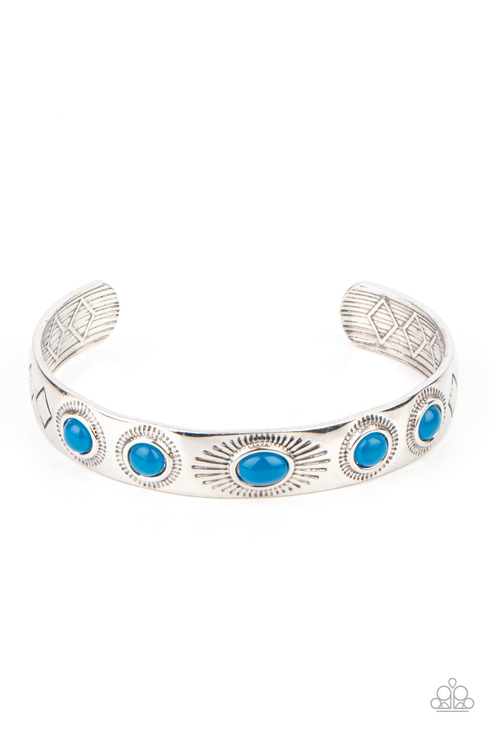 Dewy Mykonos Blue beads adorn a mismatched collection of shimmery sunbursts that have been stamped into the center of a dainty silver cuff, creating a mystical pop of color around the wrist.