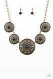 Gradually increasing in size near the center, round brass frames radiating with sunburst patterns link below the collar. Infused with shiny brass studs, the tribal inspired frames are dotted with black beaded centers for a colorful finish. Features an adjustable clasp closure.