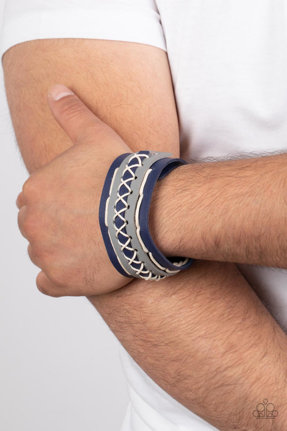 White laces crisscross across the front of a skinny blue leather band that is stitched in place across a gray leather band, creating a colorful centerpiece. The gray leather band is studded in place across the front of a thick blue leather band, resulting in rustic pops of color around the wrist. Features an adjustable snap closure.