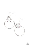 Varying in size, a glittery purple rhinestone encrusted ring links with two shiny silver hoops, creating a glamorous lure. Earring attaches to a standard fishhook fitting.