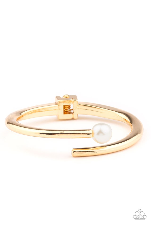Featuring a solitaire white pearl, two shiny gold bars attach to a spring-like fitting as they curl around the wrist for a modern finish.