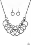 Hammered gunmetal hoops swing from the bottom of interconnected hammered links, creating an edgy industrial fringe below the collar. Features an adjustable clasp closure.