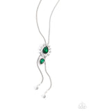 Strung along a strand of sleek silver snake chain, round white rhinestones are set in silver fittings around a larger emerald teardrop gem, giving way to an upside-down emerald teardrop gem pressed in a border of glistening white rhinestones, creating an ornate adjustable floral-inspired fringe. Additional silver beads cap the ends of the chain for a monochromatic finish. Features a bolo closure.