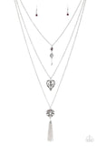 A shimmery silver key, heart-like frame, and leafy silver pendant layer down the chest in a whimsical fashion. Infused with a playful tassel, glittery purple rhinestones adorn the upper and lowermost frames for a sparkling finish. Features an adjustable clasp closure.