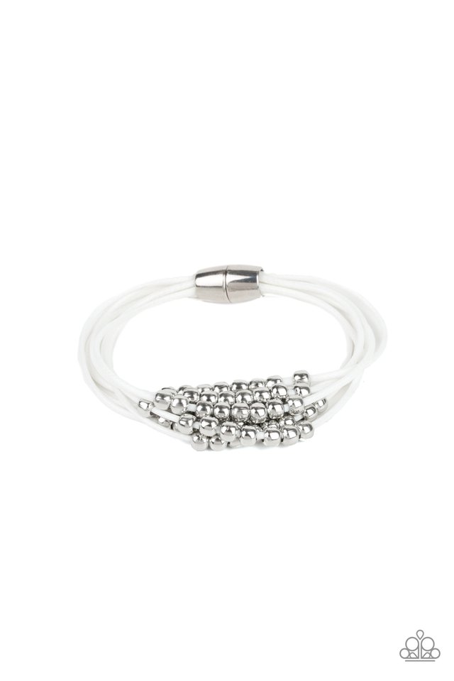 A collection of dainty silver beads slides along shiny white cords, creating vivacious layers around the wrist. Features a magnetic closure.