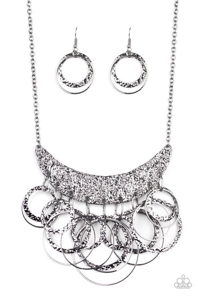 Hammered and embossed in a foil-like finish, a gunmetal moon-like frame bows below the collar. Dainty gunmetal hoops and matching hammered rings cascade from the bottom, creating an edgy fringe. Features an adjustable clasp closure. Sold as one individual necklace. Includes one pair of matching earrings.