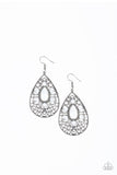 A collection of faceted white beads adorns the front of a frilly silver teardrop, creating a flowery frame. Earring attaches to a standard fishhook fitting.