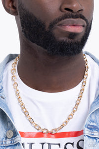 Textured gold hoops and angular oval gold links boldly connect across the chest, resulting in an intense industrial statement piece. Features an adjustable clasp closure.
