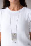 Attached to a lengthened silver chain, a hammered silver bar gives way to a fringe of shimmery silver chain, yellow stone beads, and silver feather frames for a seasonal look. Features an adjustable clasp closure.